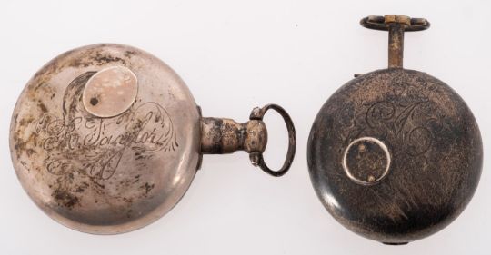 A silver open-faced pocket being the inner to a pair-cased watch the fusee movement signed Gowland, Sunderland, having a pierced and engraved backcock engraved Improved Patent, diameter 50mm, total weight ca. 117.08gms.Another with an unsigned movement and having a pierced and engraved backcock to the plain steel balance with the case hallmarked for Birmingham and stamped WH, probably the casemaker William Hammon, Coventry, diameter 45mm, total weight ca. 79.49gms.