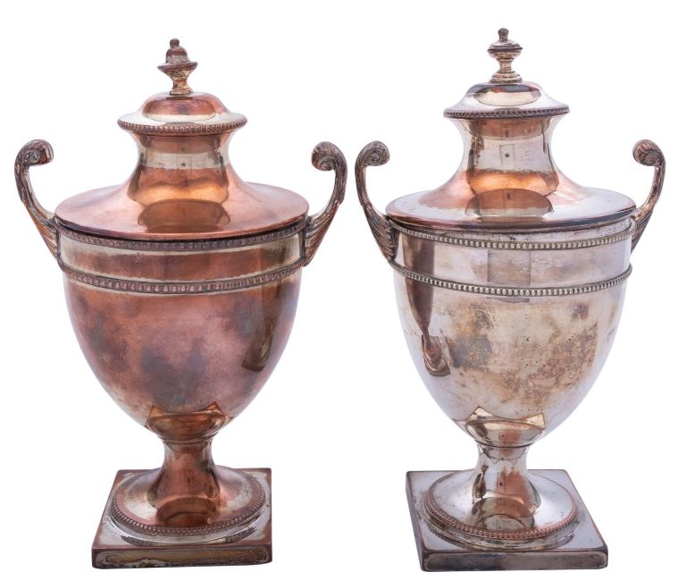 A pair of Sheffield Plated candlesticks of Robert Adam design, with ram's head motifs, 29.5cm high together with a pair of classical urns and a pair of early 19th century circular base column candlesticks, (6)