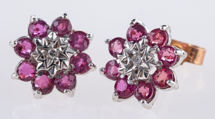 A pair of 9ct yellow & white gold stud earrings, of flowerhead design and each set with a single-cut diamond, surrounded by circular-cut rubies, post & butterfly fitting, UK hallmark, diameter approx. 0.9cm, 1.84grams.