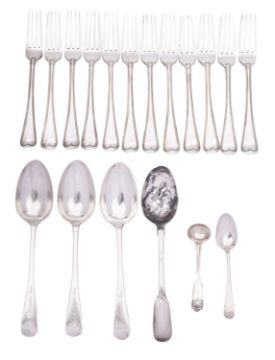 A part matched of silver flatware comprising: three Victorian Old English pattern table spoons by Chawner & Co, London 1864, engraved with date, initials T Sir R.P, 1864 LINCOLN'S INN; a Fiddle pattern table spoon by William Eaton, London 1833; set of twelve Old English and Thread pattern forks by Holland, Aldwinckle & Slater, London 1908, all engraved with coat of arms, dated and initialled; and a Georgian and a Victorian teaspoon, 1264g (40.5 oz) (18)