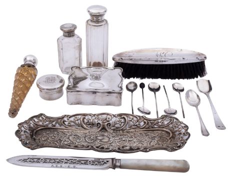 A group of silver items to comprising: a Victorian silver hair pin tray by Andrew Barrett & Sons, Birmingham 1900 of rectangular form with pieced and embossed decoration, a silver and mother of pearl paper knife Walker and Hall, Sheffield 1918, a small circular pot, a square jewellery casket, a cut glass and silver scent bottle by J.N.M, Birmingham 1885, of tapering form, two silver and glass dressing table bottles, a clothes brush and a cased set of five coffee bean spoons, 471g (15oz), (9)