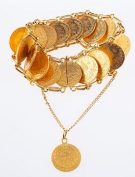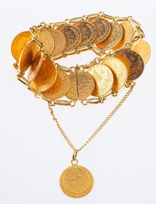 A 22ct yellow gold bracelet, composed of nineteen '50' Piastra gold coins (Turkish), dated 1911, overlapping design with sliding pin fastener and safety chain, bracelet links and clasp unmarked & untested, total gross weight 83.3grams, comes with a photocopy of Insurance Valuation dated 2nd July 2018 for £3,500.