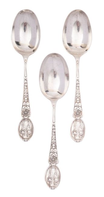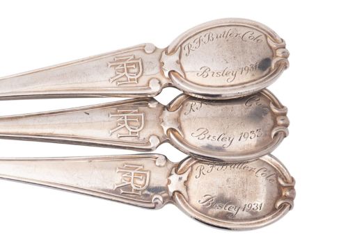 A group of three Bisley silver trophy spoons, maker Elkington & Co. Birmingham 1930 and 1949, 12ozt..