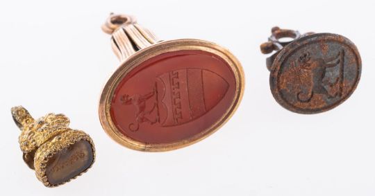 A group of hardstone fob seals, including five carnelian set fob seals, unmarked, tests as 9ct, total gross weight approx. 55.2grams and two other fob seals, unmarked & untested, total gross weight 14.5grams, (7)
