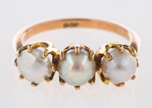 A pearl ring, claw set with three cultured pearls, pearls approx. 5.5mm to 5.8mm, marked 9ct, size L1/2, 2.8grams.