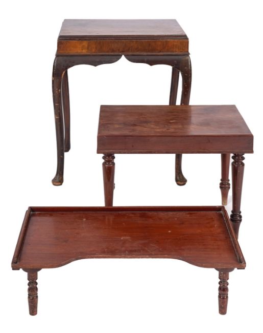 A mahogany bidet, second quarter 19th century; with rectangular cover, (lacking ceramic element), 45cm high, 60cm long; a mahogany side table in George II taste, 20th century, 73cm high; and a Victorian mahogany bed tray, late 19th century, with turned legs, 75cm wide
