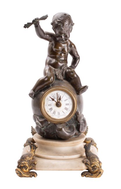 An alabaster and bronze mantel clock having an eight-day duration movement, the round dial with alarm setting hand, within a bronze setting surmounted by a putto and embossed H. Capy to the rear, standing on an alabaster base with dolphin feet, height 34cms.