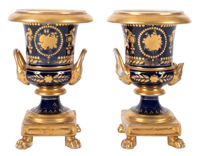 A pair of Continental porcelain urns, of campana form on square bases with lion paw supports, with gilt decoration on a blue ground, 15cm high, damages.