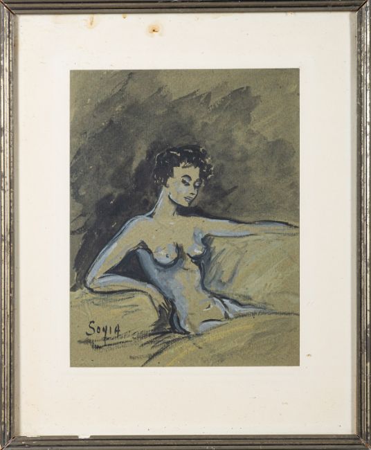 Franz Laskoff (Polish,1869-1921) Portrait of a lady wearing a wide brimmed hat A lithographed cut out 26 x 16.5cm signed lower right, Together with two Folies Bergere gouaches of dancing girls signed M. Crichton, each 39 x 21cm and a pair of monochrome watercolours of nudes, each 22 x 17cm inscribed 'Lucille' and 'Sonia' (5)