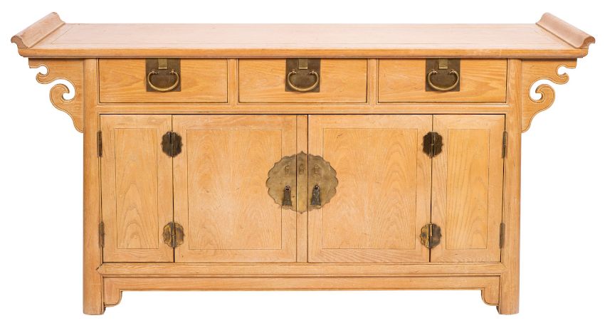 An American bleached oak sideboard, by Raymond K. Sobota for Century Furniture, ca 1970s; in Chinese taste; the cleated top with raised ends, above three short drawers, with brass swing handles, flanked by fret cut scrollwork at each side; above twin articulated doors with further brasswork, on straight feet; brass maker's plaque in one drawer; 88cm high overall, 171cm wide, 46cm deep.