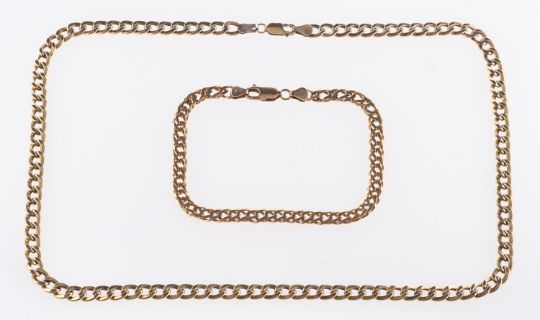 A 9ct yellow gold chain & bracelet, the chain of oval curb links, UK import mark, 375, length approx. 50.0cm; and a flat double curb link bracelet, UK hallmark, 375, length approx. 21.0cm, total gross weight 25.3grams, (2).
