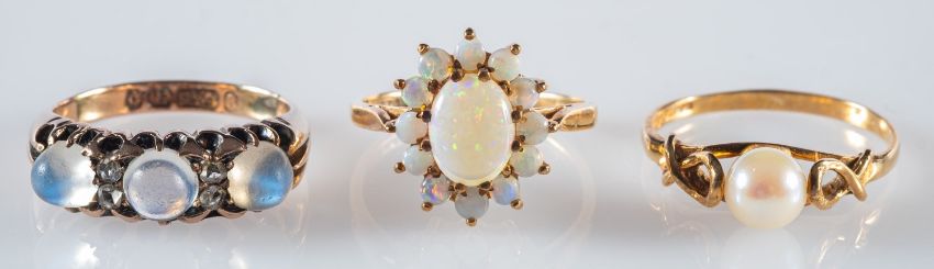 A group of three 9ct yellow gold rings, to include a 9ct pearl set ring, UK hallmark, size N, 1.55grams; a 9ct cluster ring set with opal cabochons, size K, 2.20grams; and a 9ct Victorian ring set with three moonstone cabochons interspaced with four rose-cut diamonds, UK hallmark, size M to M1/2, 4.54grams, (3).