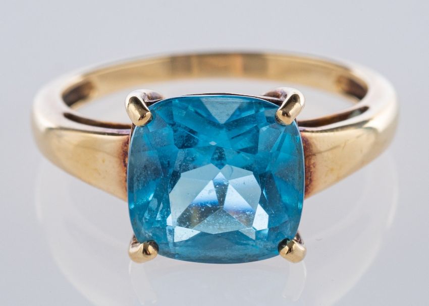A 9ct yellow gold ring, set with a mixed square-cut blue topaz, UK import mark, size P1/2, 3.56grams.