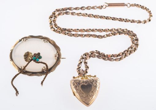 A locket pendant and brooch, a heart shaped locket on a fancy link chain, chain marked 9ct, locket unmarked and untested, total gross weight 11.19grams; and a brooch set possibly with chalcedony? (needs to be tested) with a central foliate and flower set with turquoise cabochons (some missing), unmarked and untested, 9.67grams, (2)