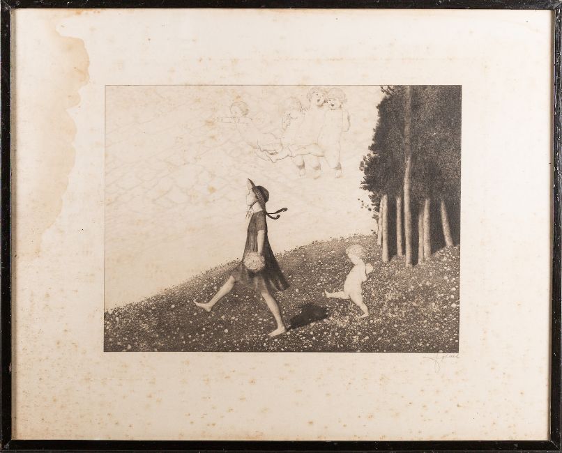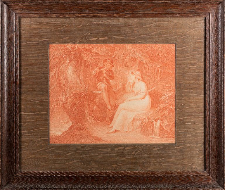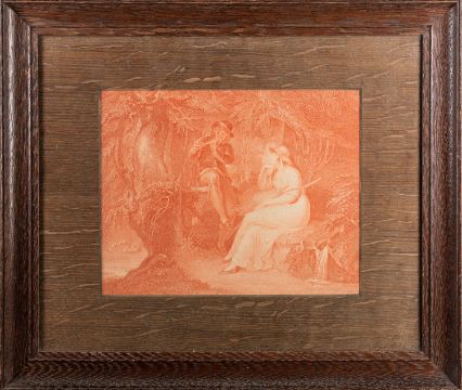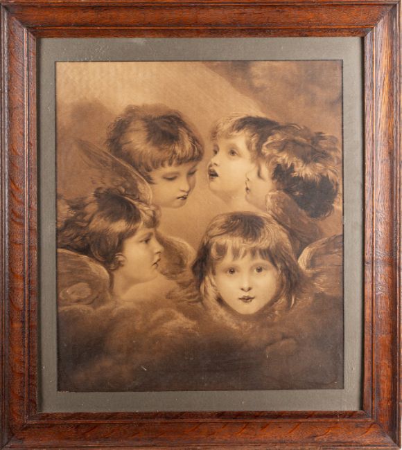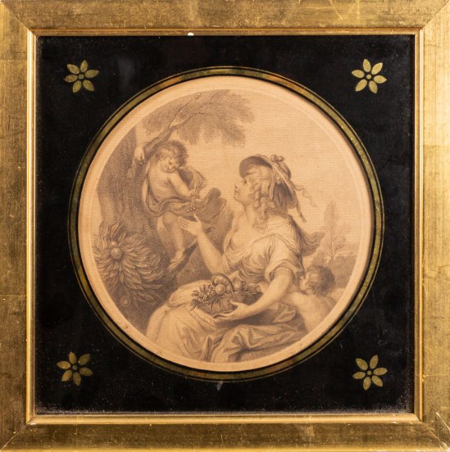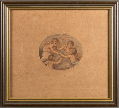 After Giovanni Battista Cipriani (British, 1727 - 1785) - Pomona - Stipple engraving - 19.5 x 19.5cm (tondo) - Together with a print of The Cherub Choir (five portraits of Lady Isabella Gordon) after Sir Joshua Reynolds, another two engravings of Cherubs and another of a couple in woodland. (5)