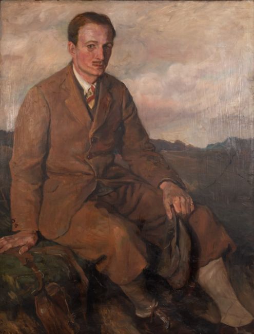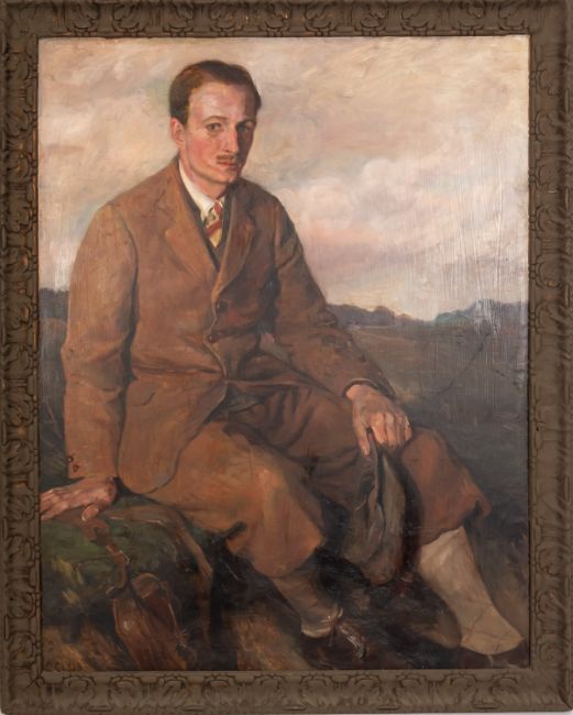 C. Collins (British, early 20th Century) -Country gentleman seated in landscape -Oil on board -136.5 x 106cm -Signed