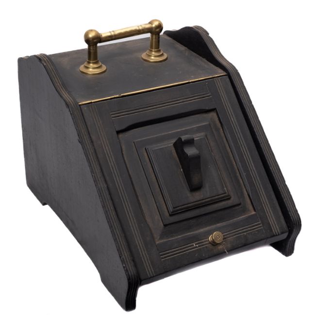 An Edwardian ebonised and brass mounted coal box with sloping hinged fall, 35cm wide, together with an Edwardian ebonised firescreen, with turned baluster top rail, inset with a needlework panel depicting a parrot amidst flowers and foliage, 65cm wide.