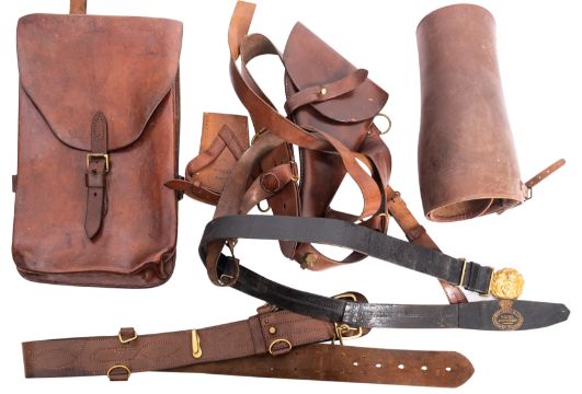 An assortment of military leather items, late 19th / early 20th century; including a pair of gaiters, a dispatch case, a Sam Browne with holster, and two other Sam Brownes