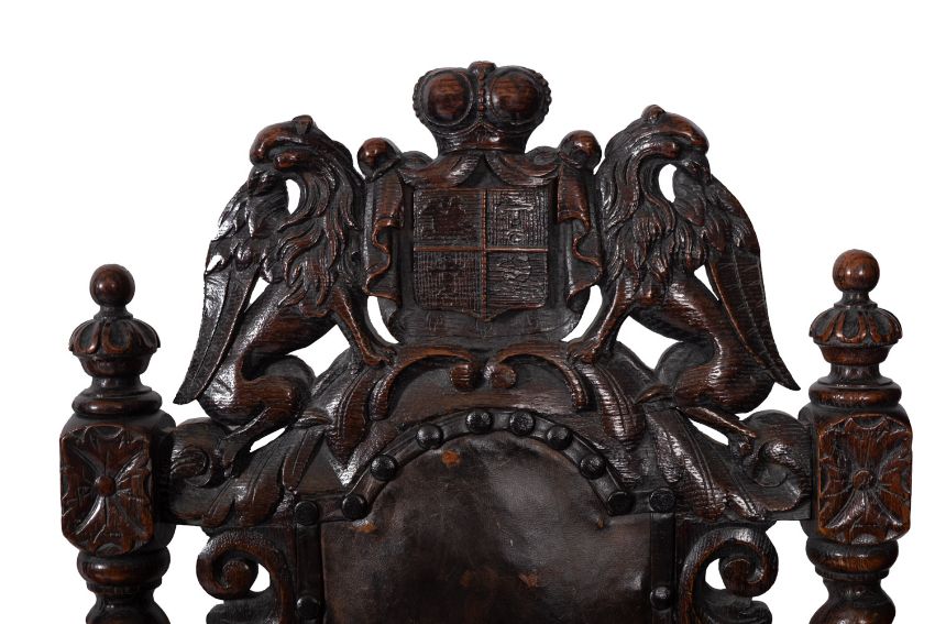 A set of four Victorian carved oak and leather upholstered side chairs in Charles II style, late 19th Century, the backs with shaped crestings with heraldic shields flanked by birds, having spirally turned uprights, the upholstered stuff-over seats with spirally turned underframing.