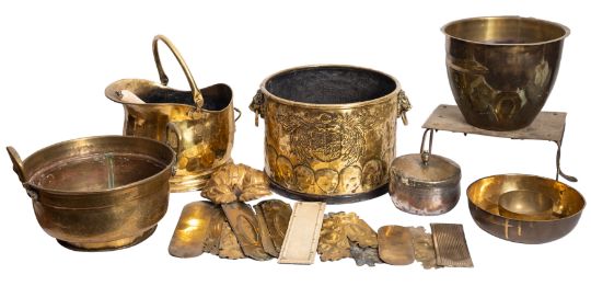 A Continental repousse work coal bin, circa 1900; of cylindrical form, with twin handles, 26cm high, 40cm wide; two Victorian brass coal scuttles, late 19th century, 35cm long; three further brass vessels; a brass trivet; a quantity of brass door plates; and other domestic metalware