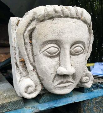 Modern carvings in Beer limestone by the cathedral works department A pair of grotesque heads Carved 2010/11 by cathedral mason Gary Morley Heights: 20 & 18cm Width (both): 20cm These are recent carvings that were experiments by the Exeter Cathedral Stonemasons, which led on to new carvings for the presbytery and choir corbel table.