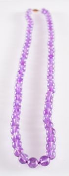 An Amethyst bead necklace, circular 8mm amethyst beads to a 9ct yellow gold clasp, clasp marked 9ct, length approx. 62.0cm, 49.5grams.