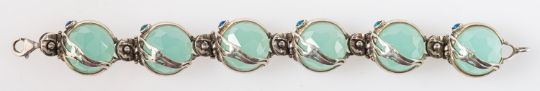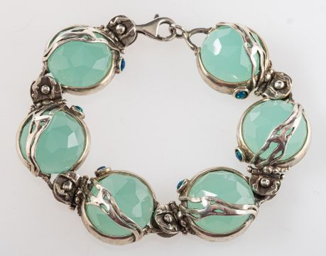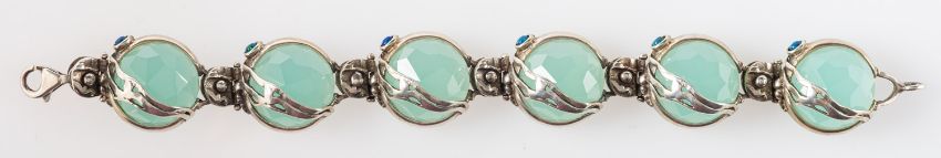 A contemporary designed bracelet, set with faceted translucent green stones and small opal doublet cabochons, marked 925, length approx. 19.0cm, 50.5grams.