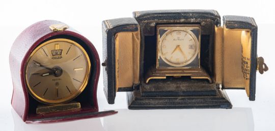 Jaeger, a small gilt travelling alarm clock the dial with baton numerals, alarm setting aperture and signed Jaeger Recital 8, the round case on a plinth, height 5cm, with leather travelling case, along with a small brass travelling clock with a watch movement signed on the dial Home Watch Co, and with a leather case signed for Garrard & Co. Ltd by Appointment to Her Majesty the Queen, diameter 3.8cm.
