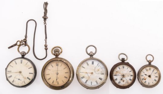 Arthur Wright, Liverpool a silver open-faced pocket watch the movement having a chain fusee, engraved backcock to the plain steel balance with the backplate engraved with the makers name Arthur Wright, Liverpool, the cream dial with black Roman numerals, gold spade hands and subsidiary seconds dial, the silver case hallmarked for Chester 1840 and stamped A.G.R. for the casemaker Samuel & Roberts of Wood Street, Liverpool, with silver chain, diameter 50mm, gross weight 100gms. A silver open-faced pocket watch signed Tilley, Manchester; diameter 50mm, total weight ca. 104.49gms. A small silver open-faced pocket watch with the Swiss bar movement having a cylinder escapement, diameter 38mm, total weight ca. 38.42gms. Waterbury USA, an open-faced pocket watch, diameter 50mm. A Swiss open-faced gun-metal pocket watch, diameter 44mm.