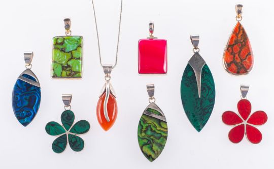 A group of nine various colourful shaped pendants, to include dyed abalone shell and hardstone pendants, some marked 925, one with silver snake chain, total gross weight approx. 61.81grams.