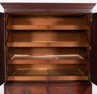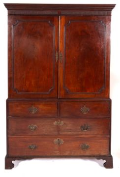 A George III mahogany linen press, circa 1800; with moulded cornice and fluted frieze, above two panel doors opening to four slides; upon a chest of two short and two long graduated drawers, on bracket feet; 190cm high, 125cm wide, 56cm deep