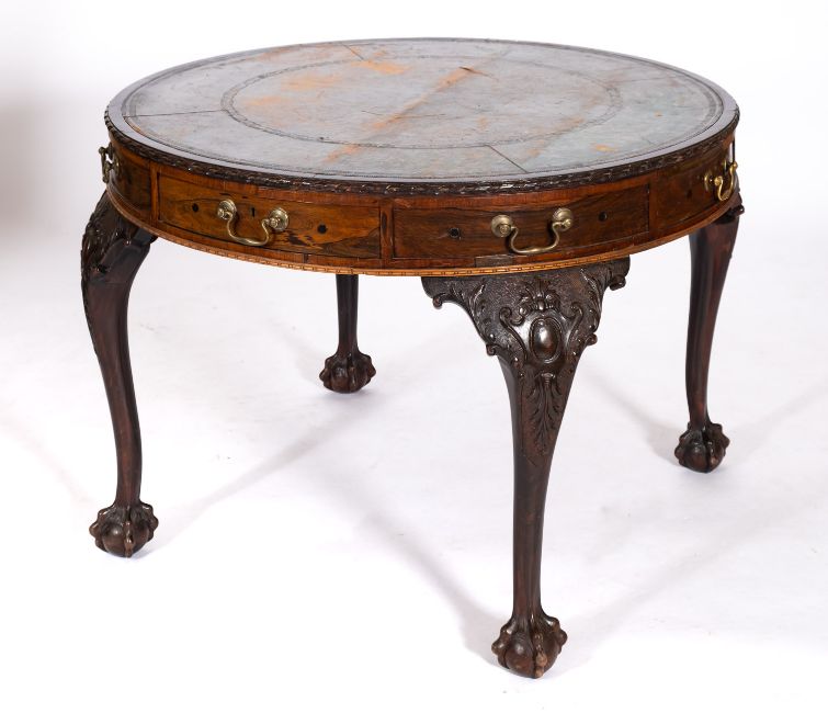 A George III and later rosewood and mahogany circular library table, elements circa 1770 and adapted; the top with tooled leather inset skiver and pin-and-ribbon carved edging; above four drawers and four faux drawer fronts, all with brass swing handles; on cabriole legs descending from relief carved foliate cartouches to ball-and-claw feet; 76cm high, 110cm diameter, 120cm wide overall