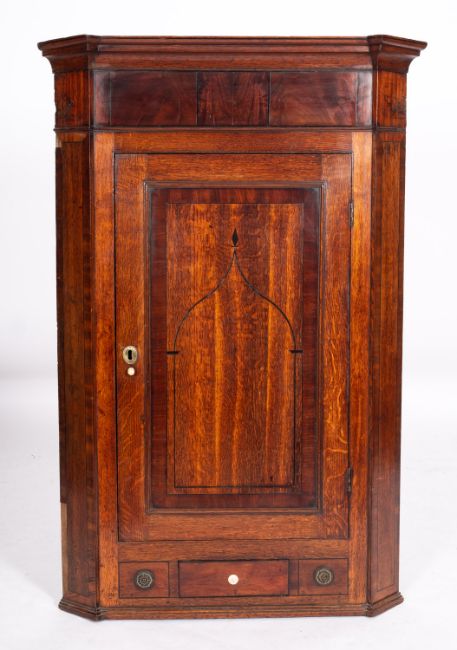 A George III oak and mahogany hanging corner cabinet. circa 1800; with shaped cornice above a door with line inlaid Gothic arch, flanked by canted pilasters, above a drawer; 121cm high, 82cm wide, 47cm deep