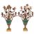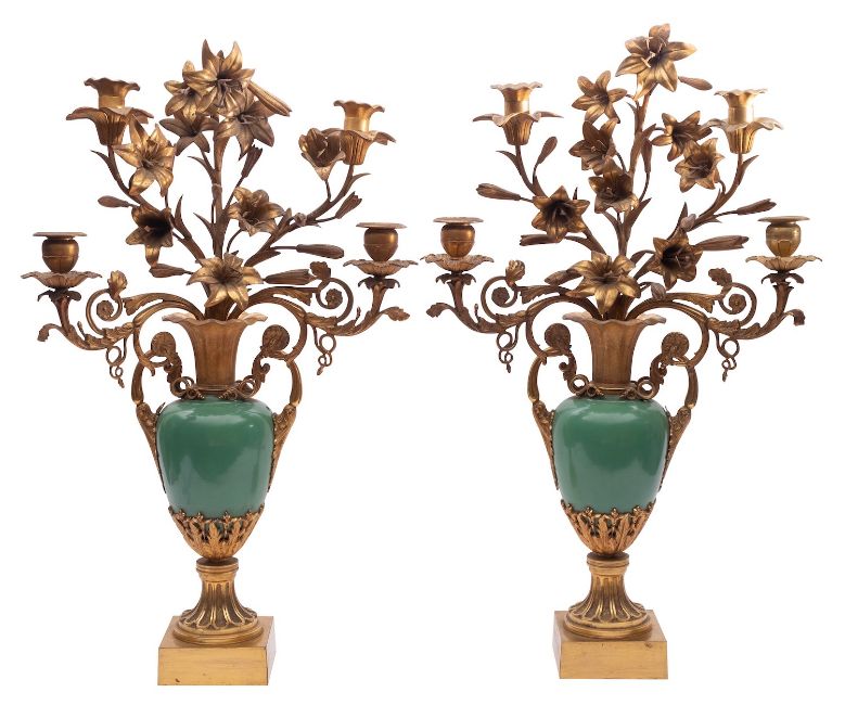 A pair of French gilt bronze and green porcelain four light candelabra, late 19th century in the Louis XVI style, each with an apple green porcelain ovoid body with scrolling foliate handles and supporting lily sprays, on fluted support and square base, 68cm