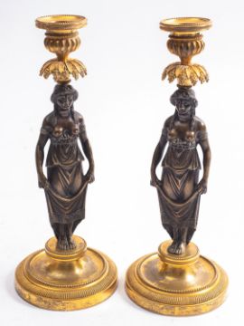A pair of Empire patinated and gilt bronze figural candlesticks, early 19th century; with beaded and lobed urn sockets above the heads of standing and partially draped maidens; on conforming circular bases; 26cm high