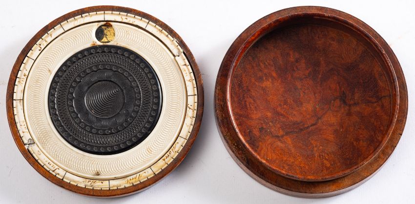 A burr walnut and Holtzapffel lathe turned ivory snuff box, early 19th century; the cover with inset moveable dial with aperture for the moon phases; 2.5cm high, 10cm diameterIvory Exemption Certificate No. FFDM8VV5
