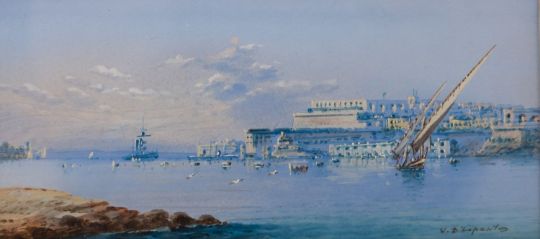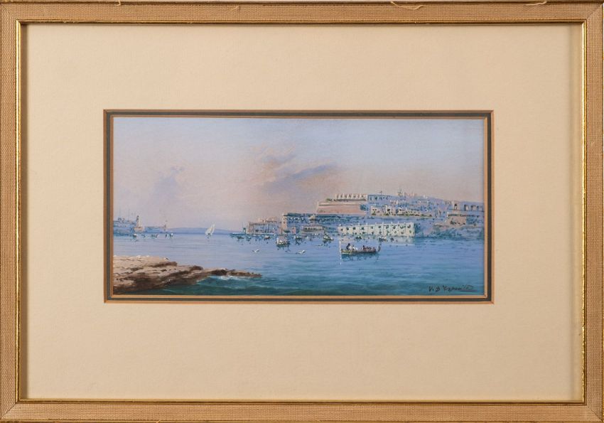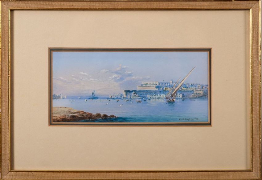 Vincenzo D'Esposito (Maltese, 1866-1946)Port of Valletta, with rocks in the foregroundTwo gouachesEach approximately 9.5 x 19.5cmEach signed lower right (2)