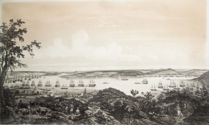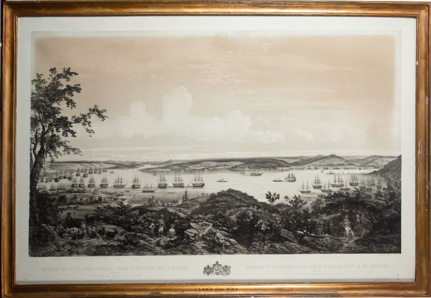 After Joseph Schranz (French, 1803-circa 1866)Anchorage of the English-French, Turkish and Egyptian fleets in the Bosphorus, October 1853Tinted lithograph 85 x 126cm overallLithograph by Sabatier and Bayot