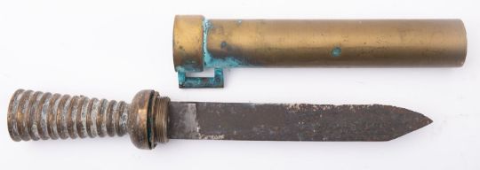 German Diver's knife, unsigned. Single edge 8 inch blade, with double edge point, ribbed brass handle, and brass scabbard with belt loop.