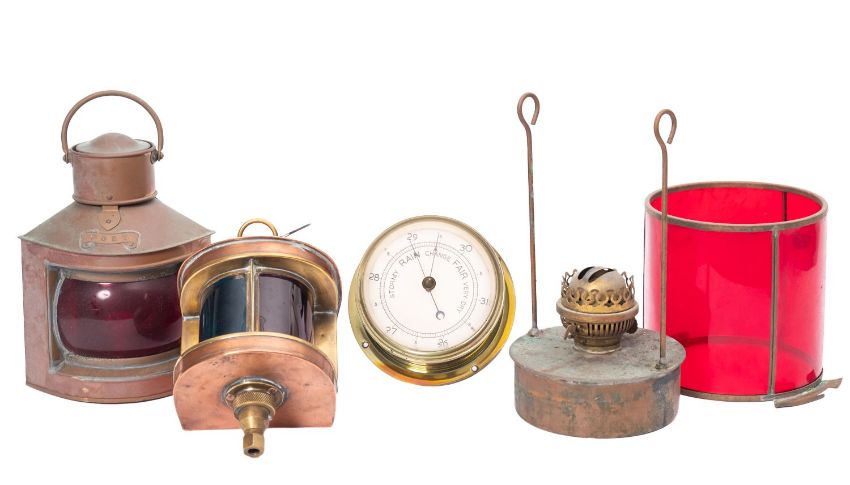 Three small copper ship's lamps, a bulkhead barometer, an oil burner and red glass shade