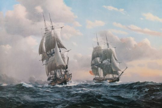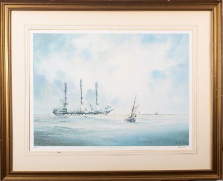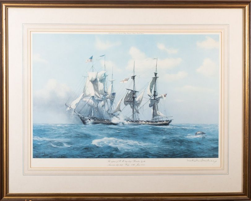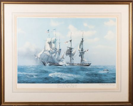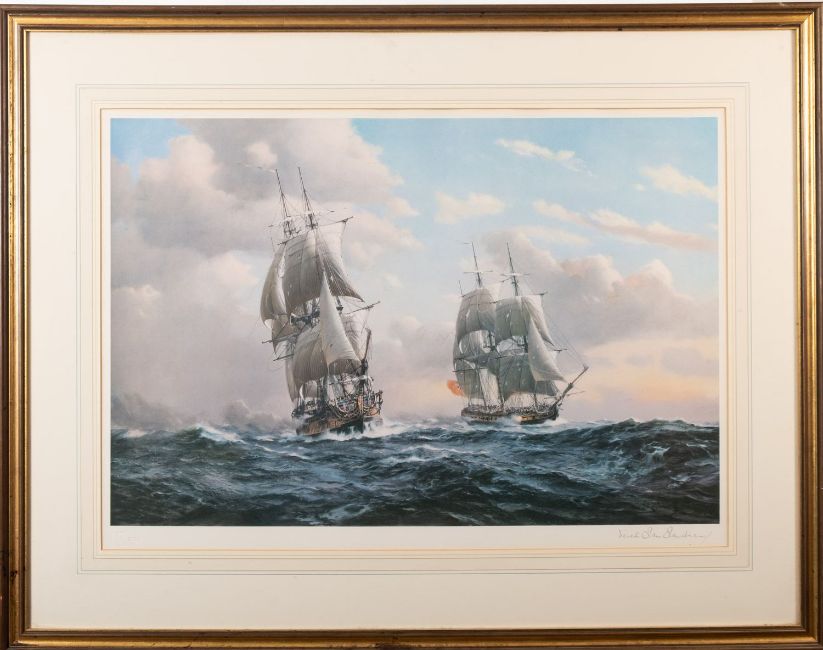 Derek George Montague Gardner (British, 1914-2007)The Barque 'Berwickshire'Minerva's action with 'Warwick'The capture of 'Reindeer' by 'WaspThree limited edition printsEach 49cm x 70cmEach signed in pencil lower right and with Fine Art Trade Guild blindstamp Together with a signed print after Peter Toms, 'The Wool Clipper Mount Stewart', 45 x 61cm (4)