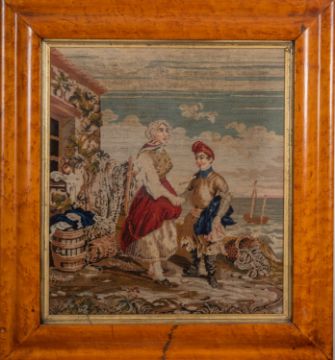 A Victorian needlework of a young sailor and his mother, in a swept maple frame, 44 x 39cm.