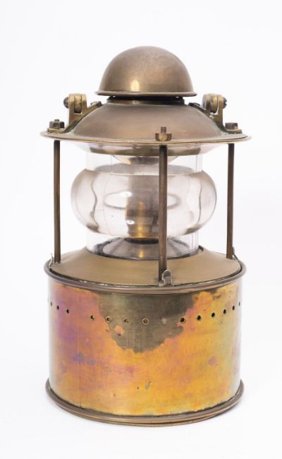 A circular brass toplght, unsigned, the domed cover with swing handle above, clear glass lens enclosing spring loaded candle ejector light source, over circular body with swing handle beneath, 35cm high