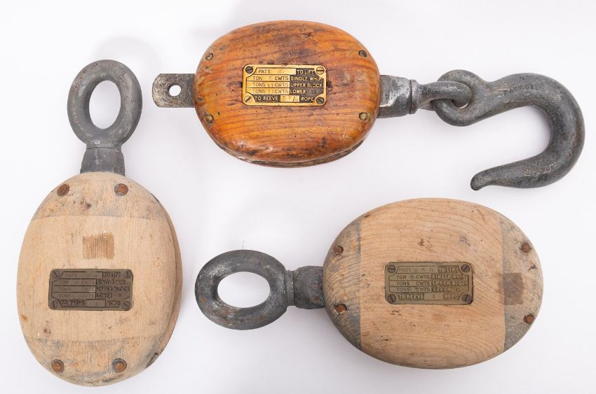 Three single whip blocks, each with brass plate to cheek (3)