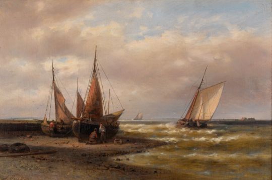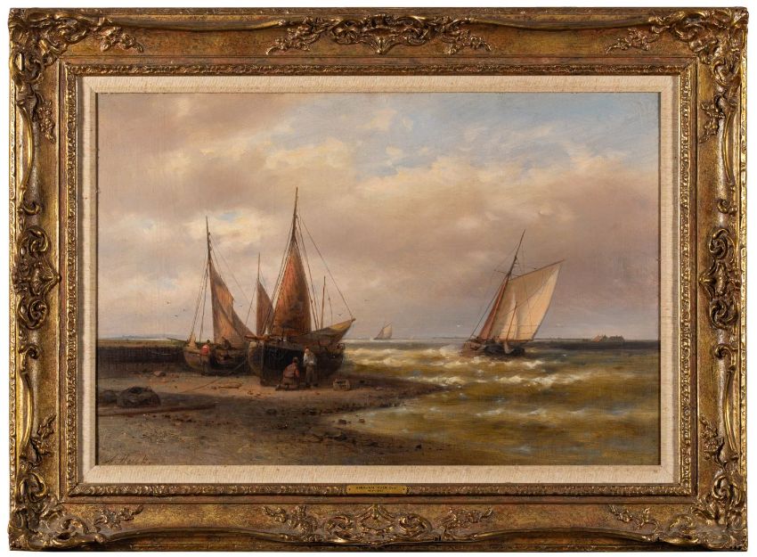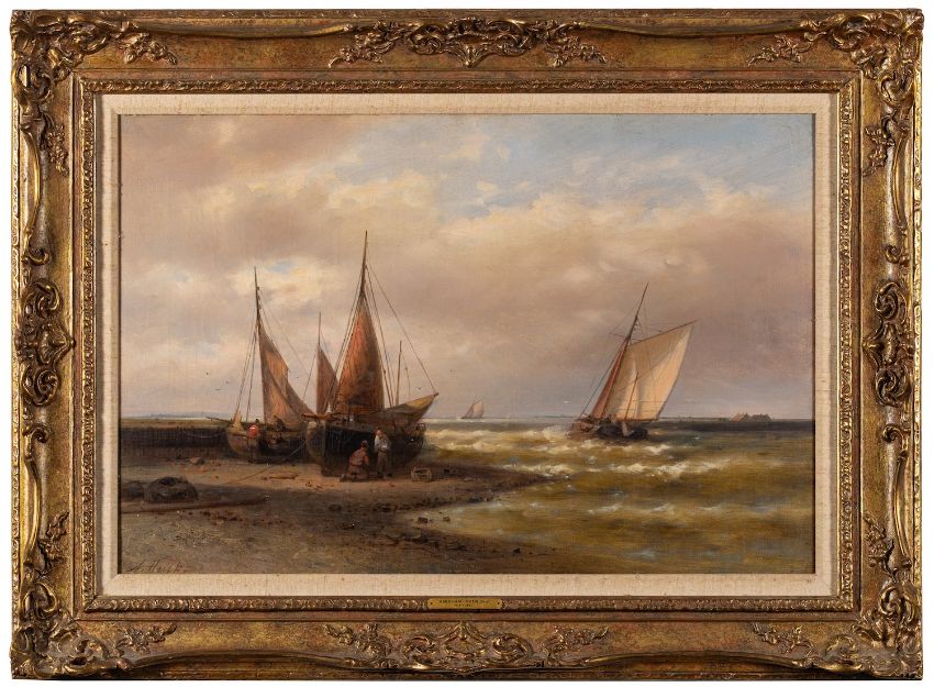 Abraham Hulk, Jr. (British, 1851-1922)Beached fishing boats with others at sea in the distanceOil on canvas39.5 x 59.5cmSigned lower left