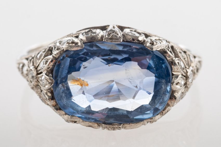 An Edwardian sapphire and diamond ring, claw set to the centre with a cushion-cut Ceylon sapphire, sapphire approx. 4.00 carats, in an openwork flower and foliate setting, set with small rose-cut and mine-cut diamonds, diamonds approx. 0.18 carat total, (one small diamond missing), inserted ring sizing spring, metal unmarked & untested, size L to L1/2, 4.37grams, accompanied by a black & white photocopy of a GCS Certificate stating that the sapphire is a natural sapphire from Sri Lanka with no indications of heating.