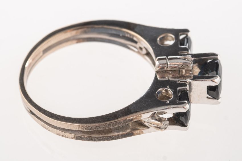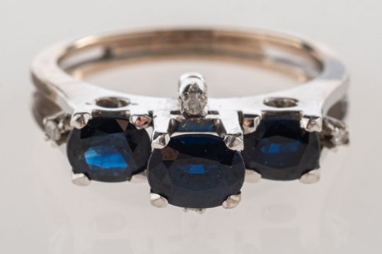 A late 1970's sapphire and diamond ring, of modernist form and set with three oval-cut sapphires and four small brilliant-cut diamonds, unmarked and untested, size N to N1/2, 4.4grams, accompanied by a photocopy of the original receipt dated 4 March 1978 from Crown Jewelry Co, Ltd, Bangkok, the receipt stating 14k white gold lady's ring set with blue sapphires and diamonds.