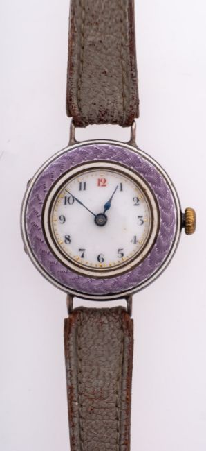 An Edwardian purple enamel and silver wristwatch the round dial with black Arabic numerals and red 12 o'clock numeral, blued steel spade hands and engine-turned purple enamel surround, the case marked .925, the movement stamped Swiss Made, diameter 28mm, total weight ca. 22.32gms.