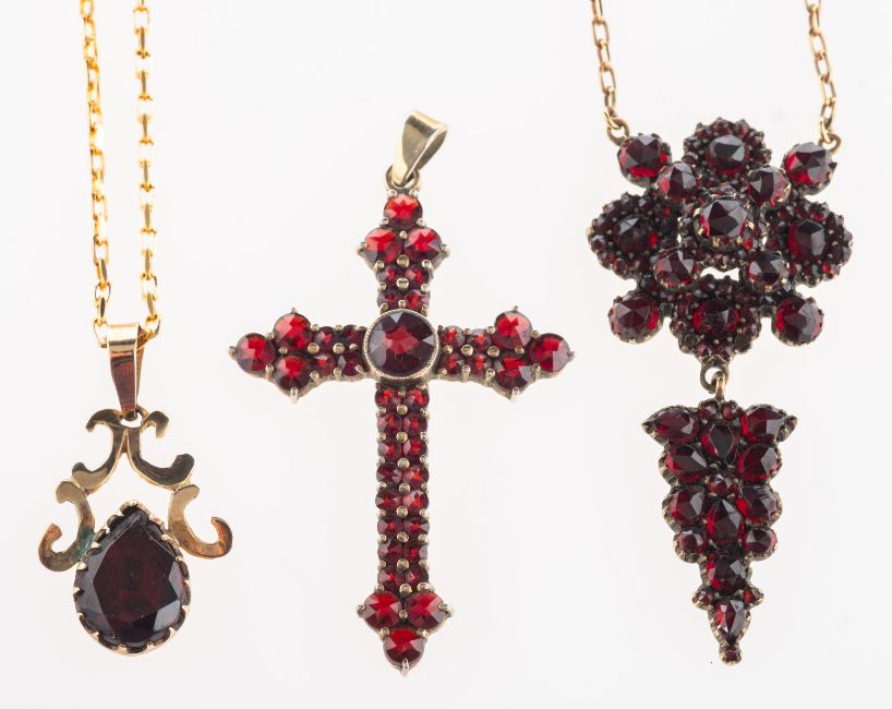A group of four items of garnet jewellery, including a Victorian Bohemian drop pendant set with a mixture of different-cut garnets, on an enclosed back setting, unmarked & untested, length approx. 4.8cm, joined to a modern 9ct yellow gold oval-link chain, UK import mark, length approx. 41.0cm; a Bohemian style cross set with garnets, unmarked & untested, length inc. bale approx. 4.8cm, 3.8grams; and a pendant set with a pear-shaped garnet, enclosed back setting, marked 9ct, length approx. 2.8cm (inc. bale), 1.9grams, on a 9ct yellow gold faceted oval link chain, UK import mark, length approx. 44.0cm, 2.4grams, (4).