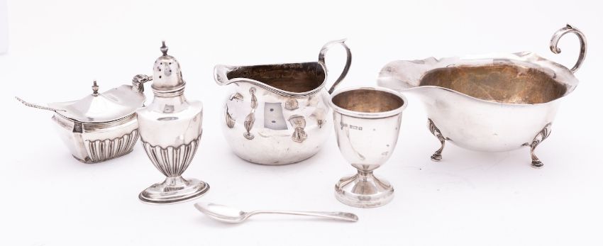 A mixed group of silver; including a George VI silver sauce boat Birmingham 1948, a silver cream jug, Birmingham 1908, a vase shaped pepperette, Birmingham 1902, an egg cup and spoon, Birmingham 1951 and a mustard pot, glass liner and spoon Sheffield marks rubbed, 287gs., (9.2ozs), gross, (7)